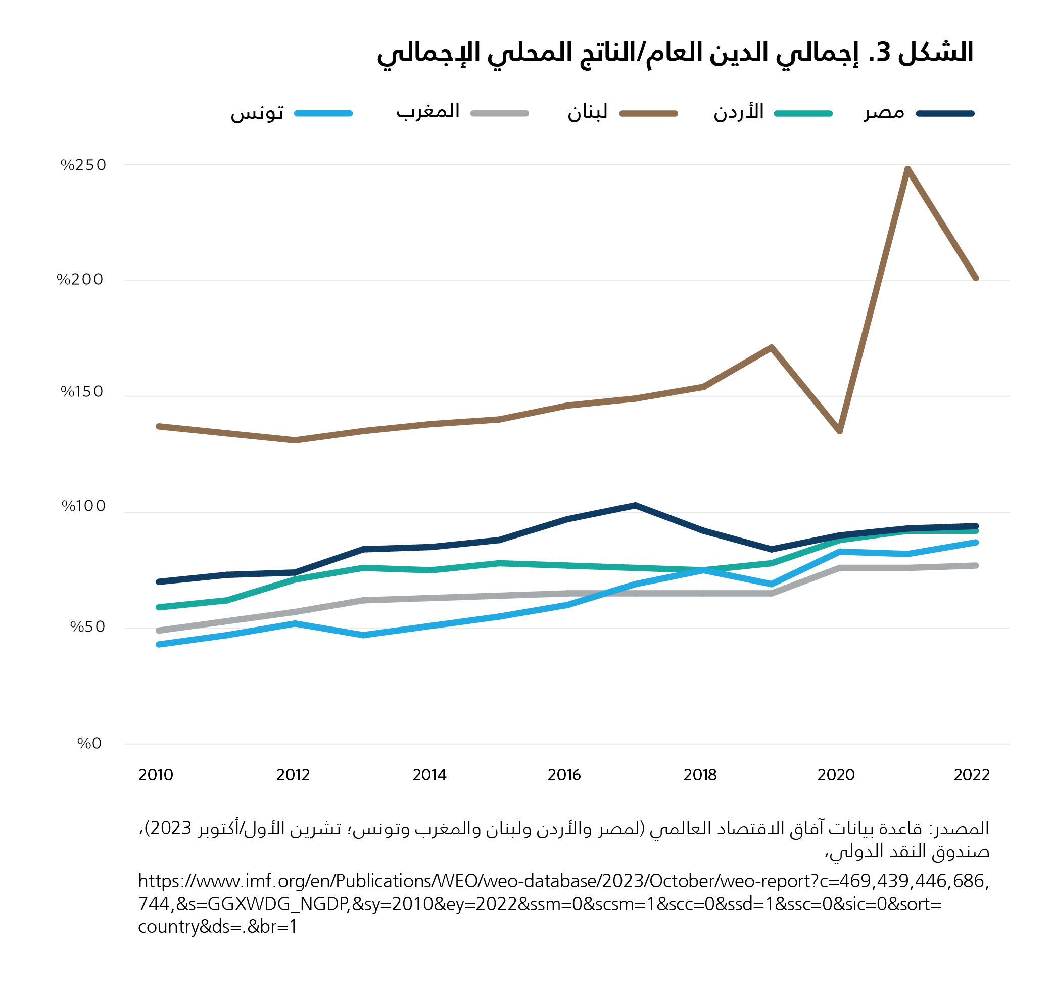 إن أزمة الديون التي تثقل راهنًا كاهل مصر وتونس ولبنان كانت قيد التشكّل منذ سنوات طويلة. إقليميًا، بدأ معدّل الدين، أو نسبة الدين العام إلى الناتج المحلي الإجمالي، بالارتفاع في دول الشرق الأوسط وشمال أفريقيا في أعقاب الأزمة المالية العالمية التي اندلعت في العام 2008 (انظر الشكل 3)، وتسارعت وتيرة هذا المنحى بُعيد الانتفاضات العربية التي انطلقت شرارتها بين العامَين 2010-2011. وكان ارتفاع معدّلات الديون مدفوعًا في الغالب بالسياسات المالية التوسعية التي انتهجتها الأنظمة العربية وانخفاض معدّلات النمو الاقتصادي خلال تلك الفترة. وفي العام 2019، تخطّت نسبة الدين العام في كلٍّ من مصر وتونس ولبنان 65 في المئة من الناتج المحلي الإجمالي، بالغةً مستوى يُعدّ خطرًا للغاية على البلدان النامية.129 ونظرًا إلى معدّلات الديون المرتفعة هذه، باتت بلدان الشرق الأوسط وشمال أفريقيا أكثر عرضةً للتأثّر بالصدمات الخارجية التي عصفت بالأسواق العالمية خلال السنوات اللاحقة.